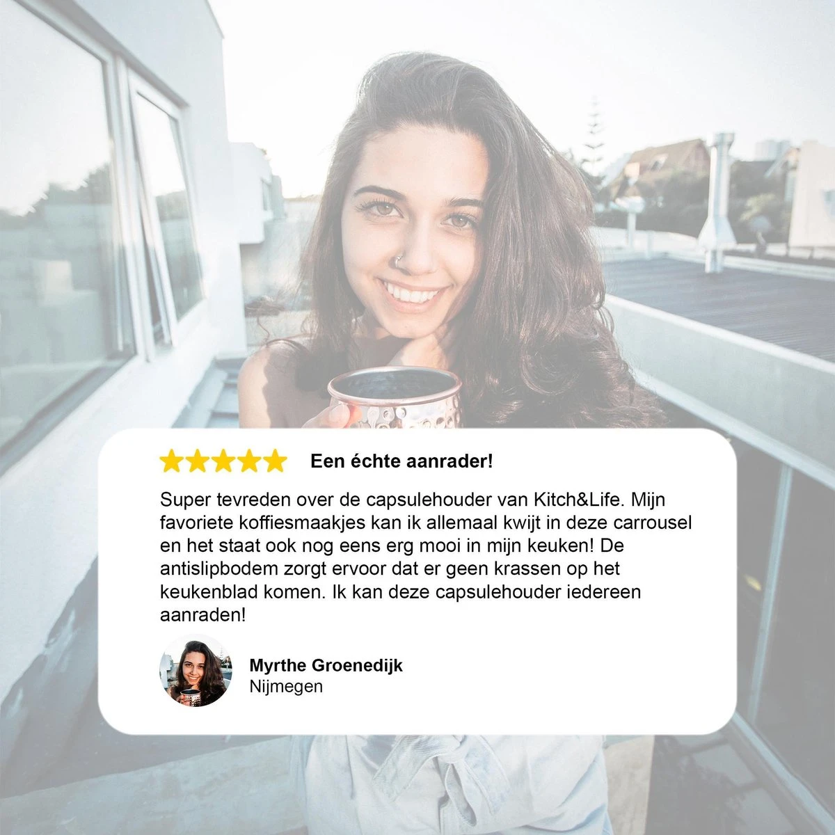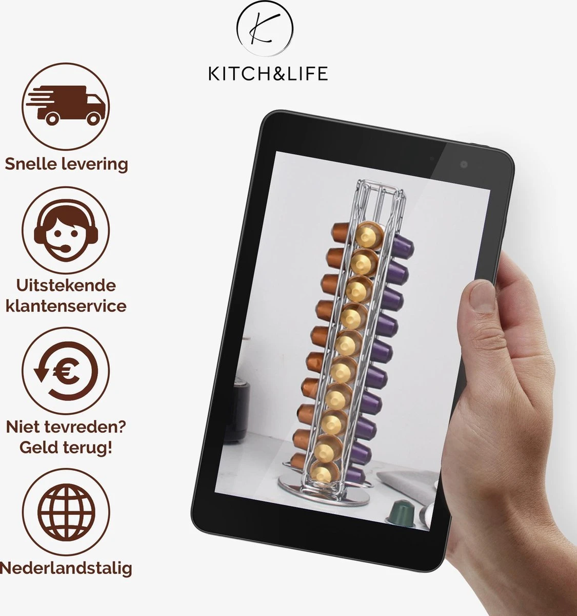 De Kitch&Life capsulehouder is gewaarborgd door onze 100% tevredenheidsgarantie. Wanneer je niet helemaal tevreden bent met ons product, dan krijg je bij een retour het volledige aankoopbedrag teruggestort. Bovendien bieden wij 1 jaar fabrieksgarantie, zodat jouw aankoop te allen tijde beschermd is.