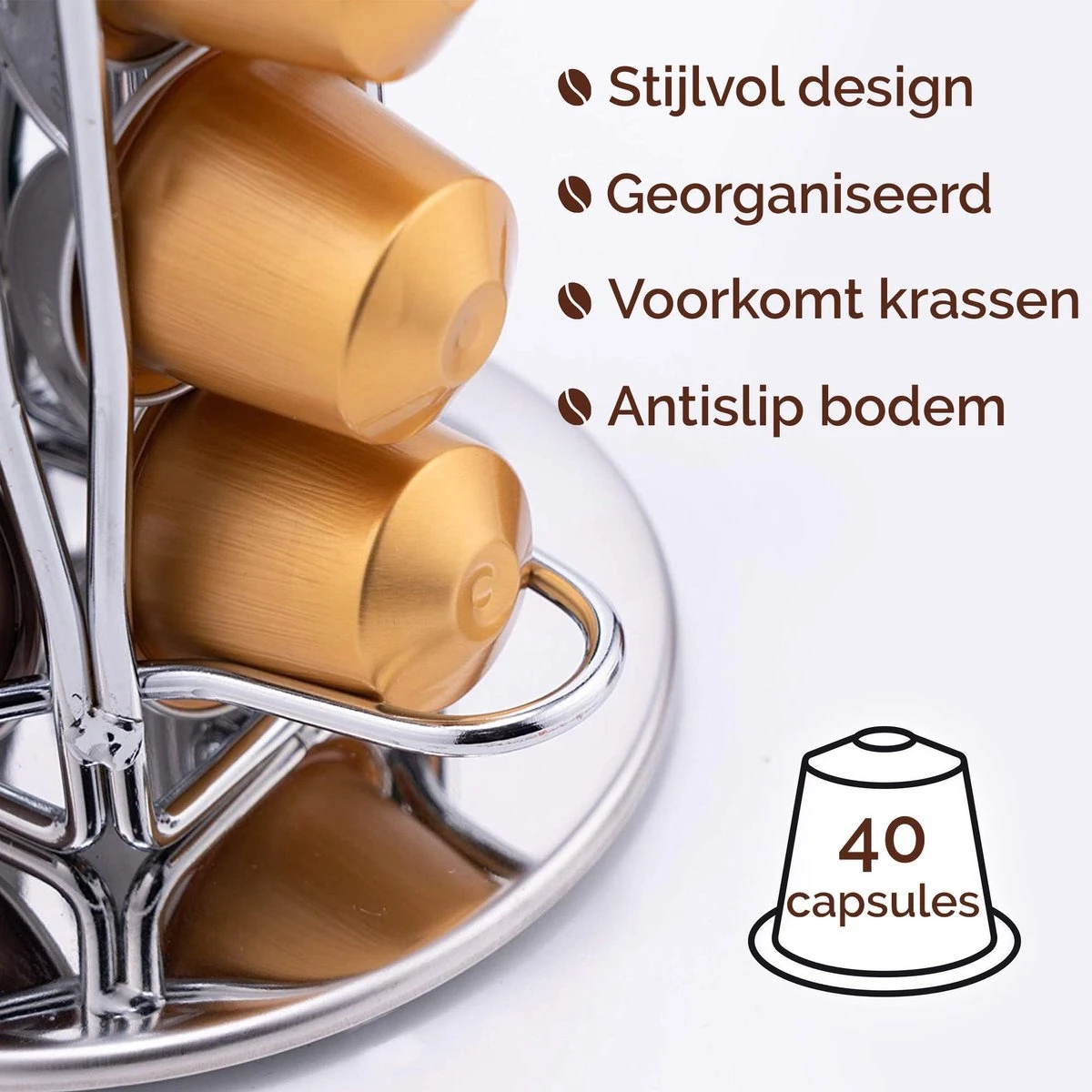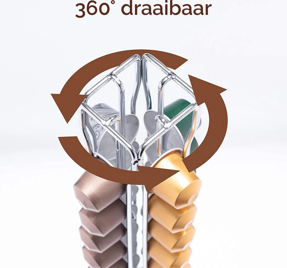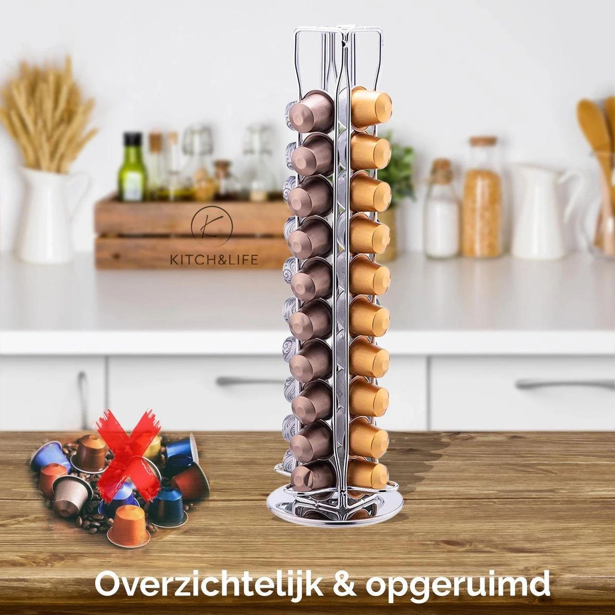 Met deze Kitch&Life Nespresso capsulehouder berg je al jouw koffiecups stijlvol en georganiseerd op. Door de handige 360º draaifunctie en vier aparte rijen heb je snel toegang tot jouw favoriete koffiesmaken. Door het strakke design van de capsulehouder geef je jouw keuken bovendien een stijlvolle ‘touch’!