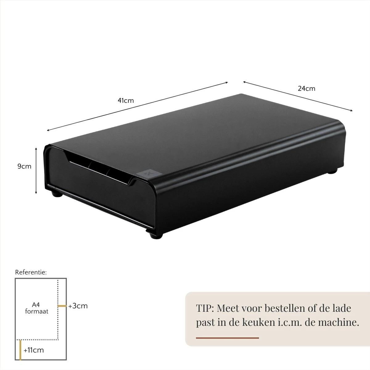 Met een diepte van ruim 40cm kan elke machine op de lade geplaatst worden en neemt het geen extra ruimte in beslag in de keuken. Zo zijn jouw capsules uit het zicht én altijd bij de hand.