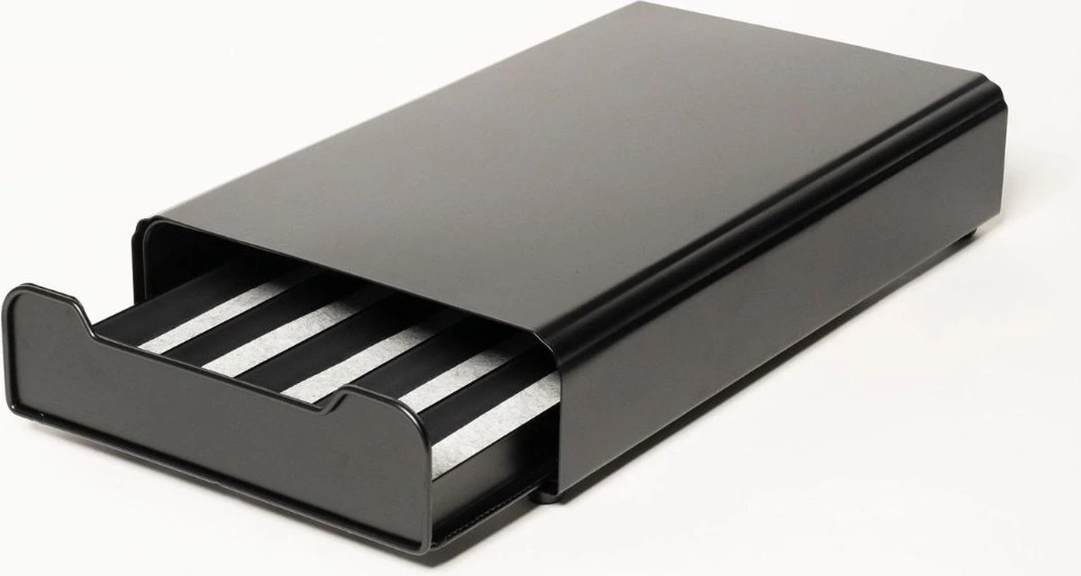 De stijlvolle capsulehouder is gemaakt van zwart gepoedercoat staal, wat mooi matcht met het design van vrijwel elke keuken. De anti-slip voetjes aan de onderkant zorgen ervoor dat de lade stevig staat op elke ondergrond. In het nieuwe, verbeterde design is luxe vilt toegevoegd aan de compartimenten, om het schuiven van de capsules te dempen.