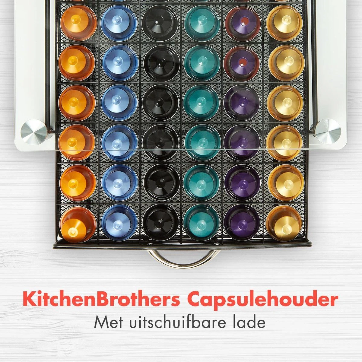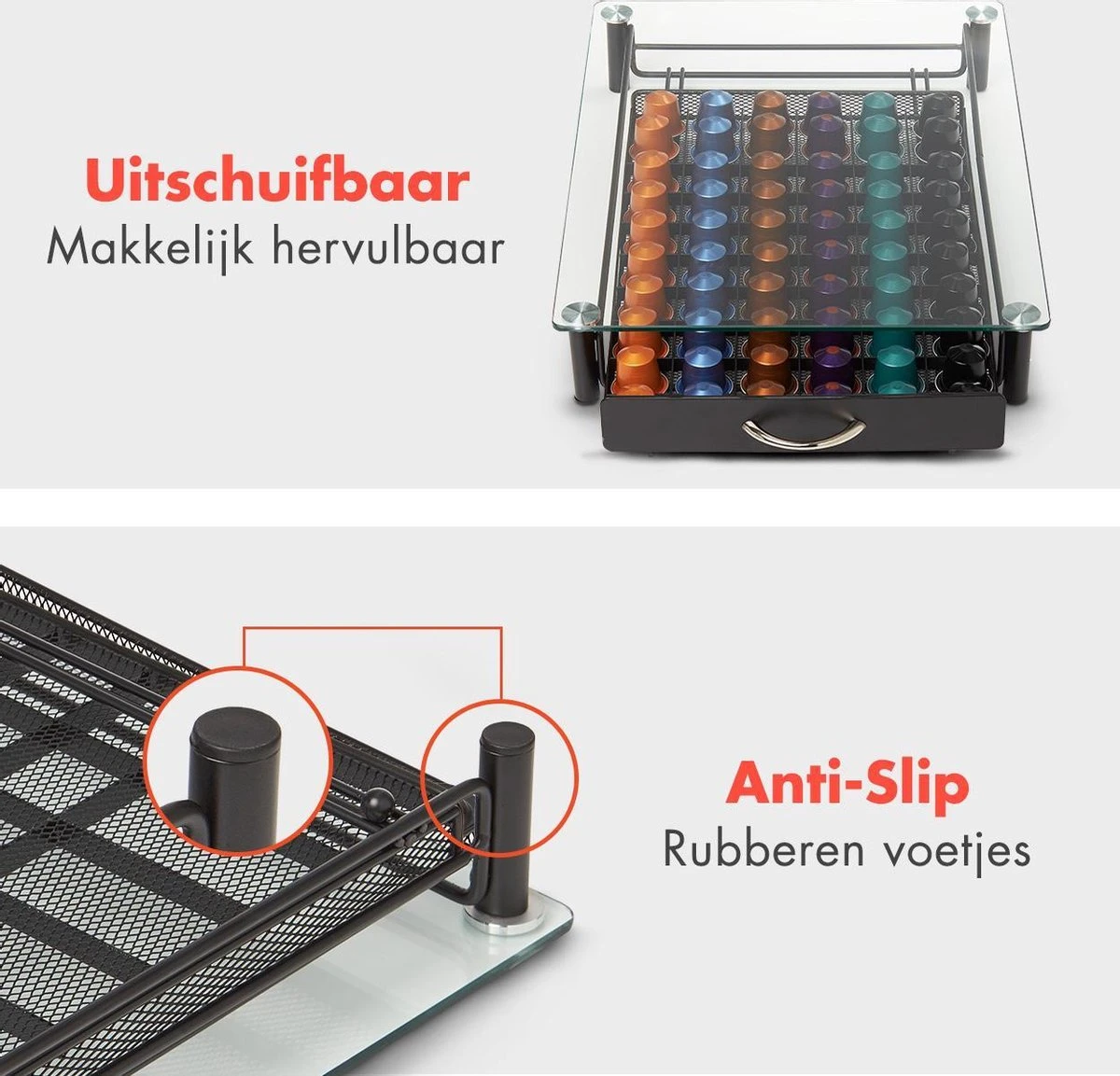 Creëer een handig overzicht van al je (N)espresso koffie cups met deze KitchenBrothers glazen capsulehouder! De capsulehouder heeft een lade met ruimte voor 60 (N)espresso koffie capsules en heeft een strak ontwerp voorzien van een glazen bovendek. Hiermee heb je altijd direct overzicht van hoeveel en welke koffiecups je in huis hebt. Het bovendek is tevens voorzien van geluidsabsorberend materiaal en biedt de mogelijkheid om bijvoorbeeld je koffiezetapparaat of je koffiekopjes op de te plaatsen.