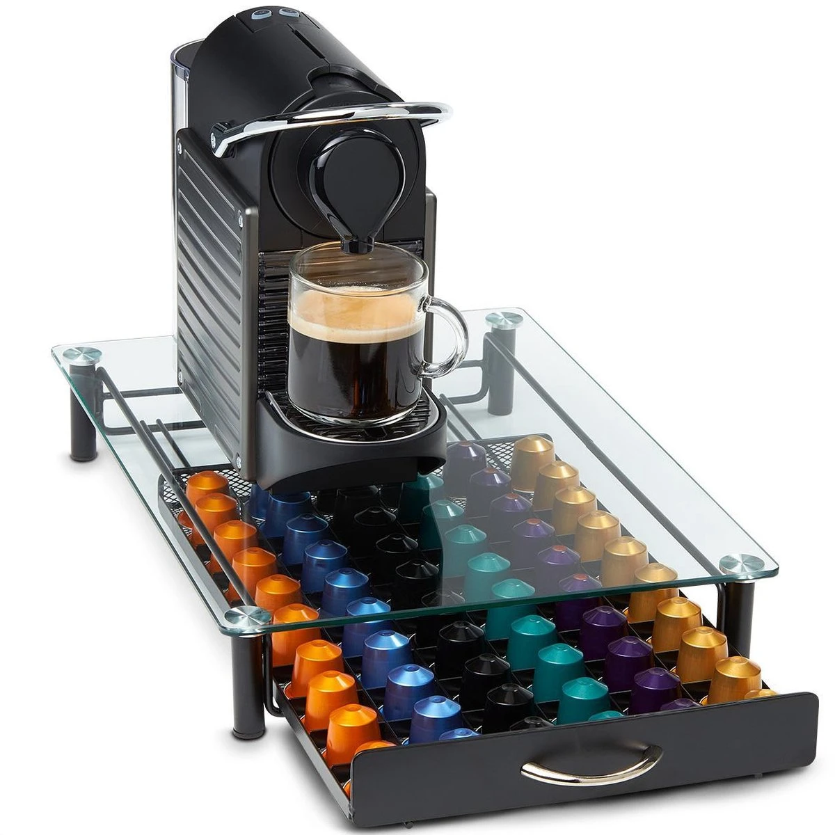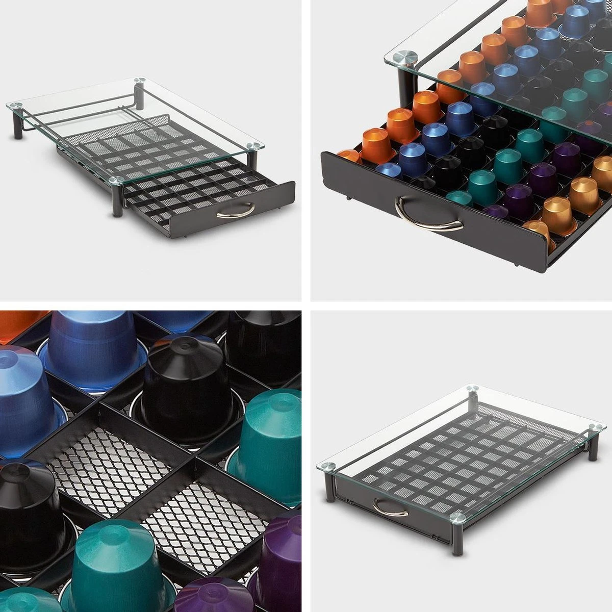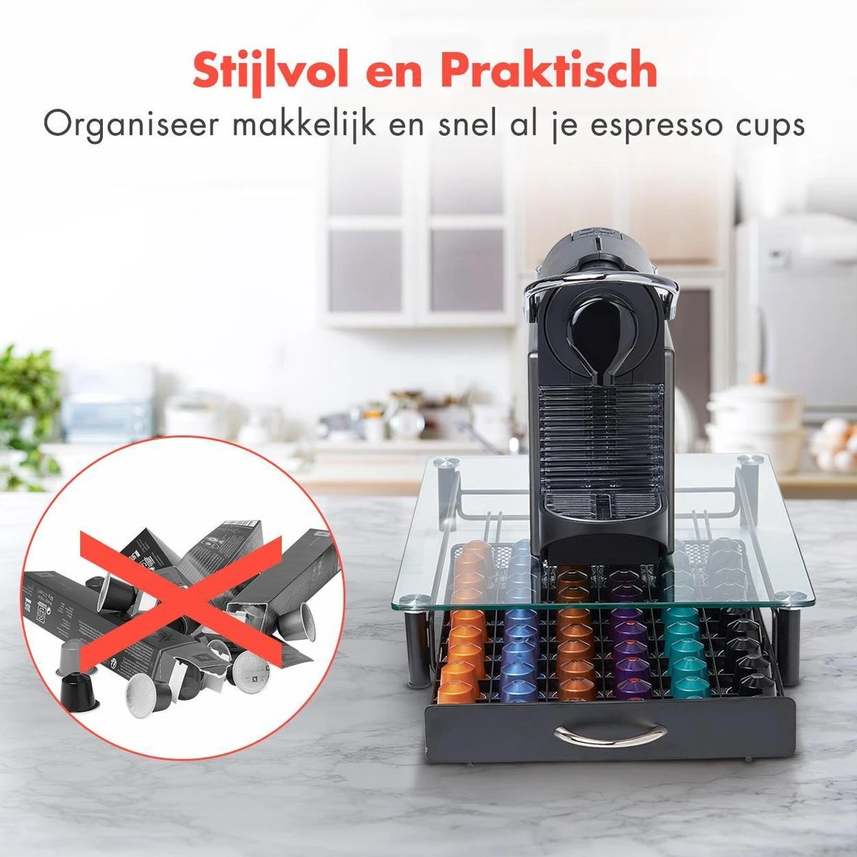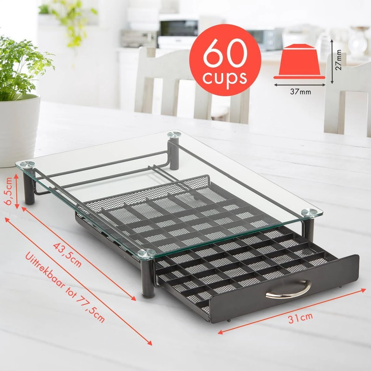 Het ontwerp met de strakke lijnen, glazen afwerking en handige lade oogt zeer modern en past vrijwel in iedere keuken. Bovendien biedt de koffiecapsulehouder een duidelijk overzicht van al je favoriete koffie smaken die je in huis hebt. Super handig dus!